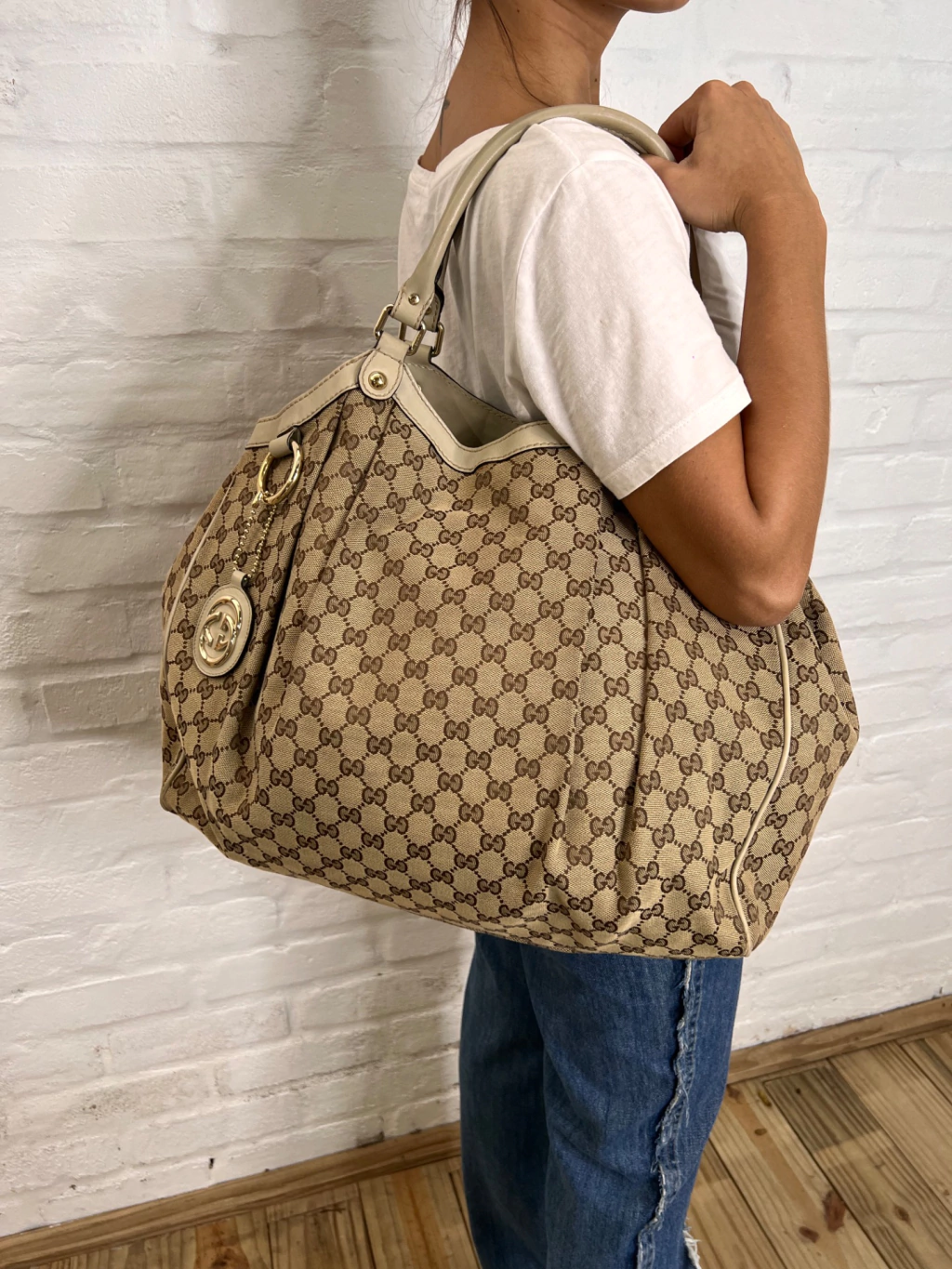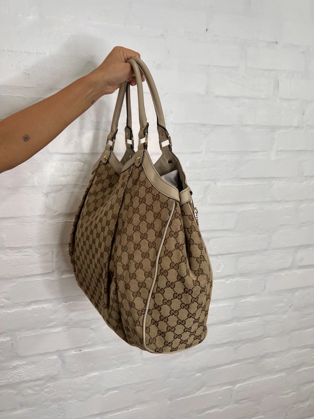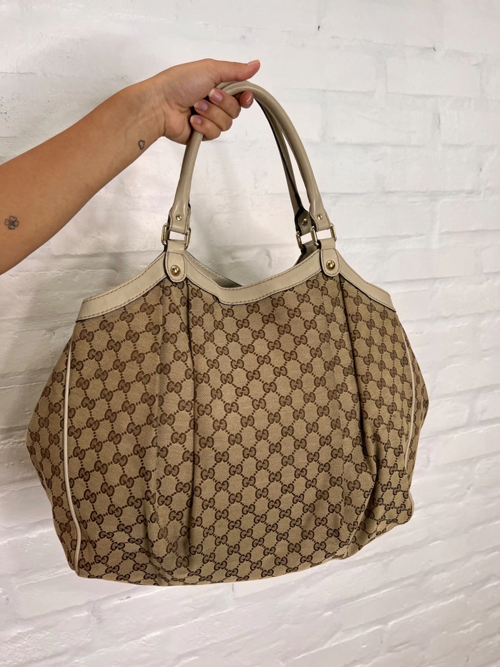 Bolsa Gucci Sukey GG Canvas Dourada Large confeccionada com estampa monograma da marca em tons de marrom e bege e couro dourado. O modelo possui compartimento único com um bolso com fecho por zíper. Conta com alça dupla estruturada de ombro em couro, ferragens douradas, extremidade superior com acabamento em couro, detalhes de studs na base das alças, botões de pressão para expansão nas laterais e fecho principal por tira de couro com botão magnético.