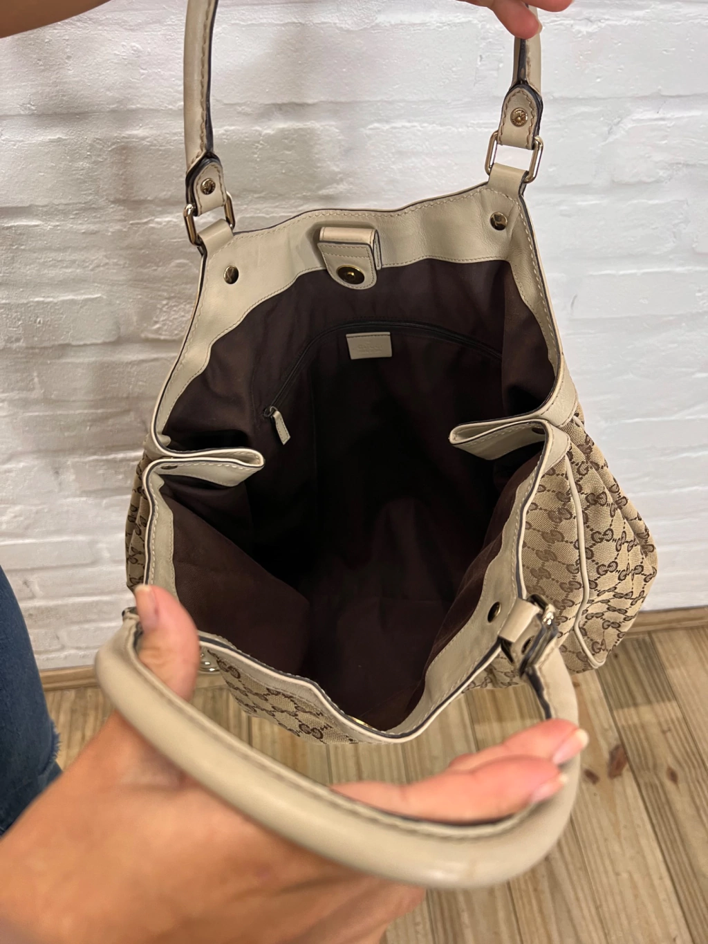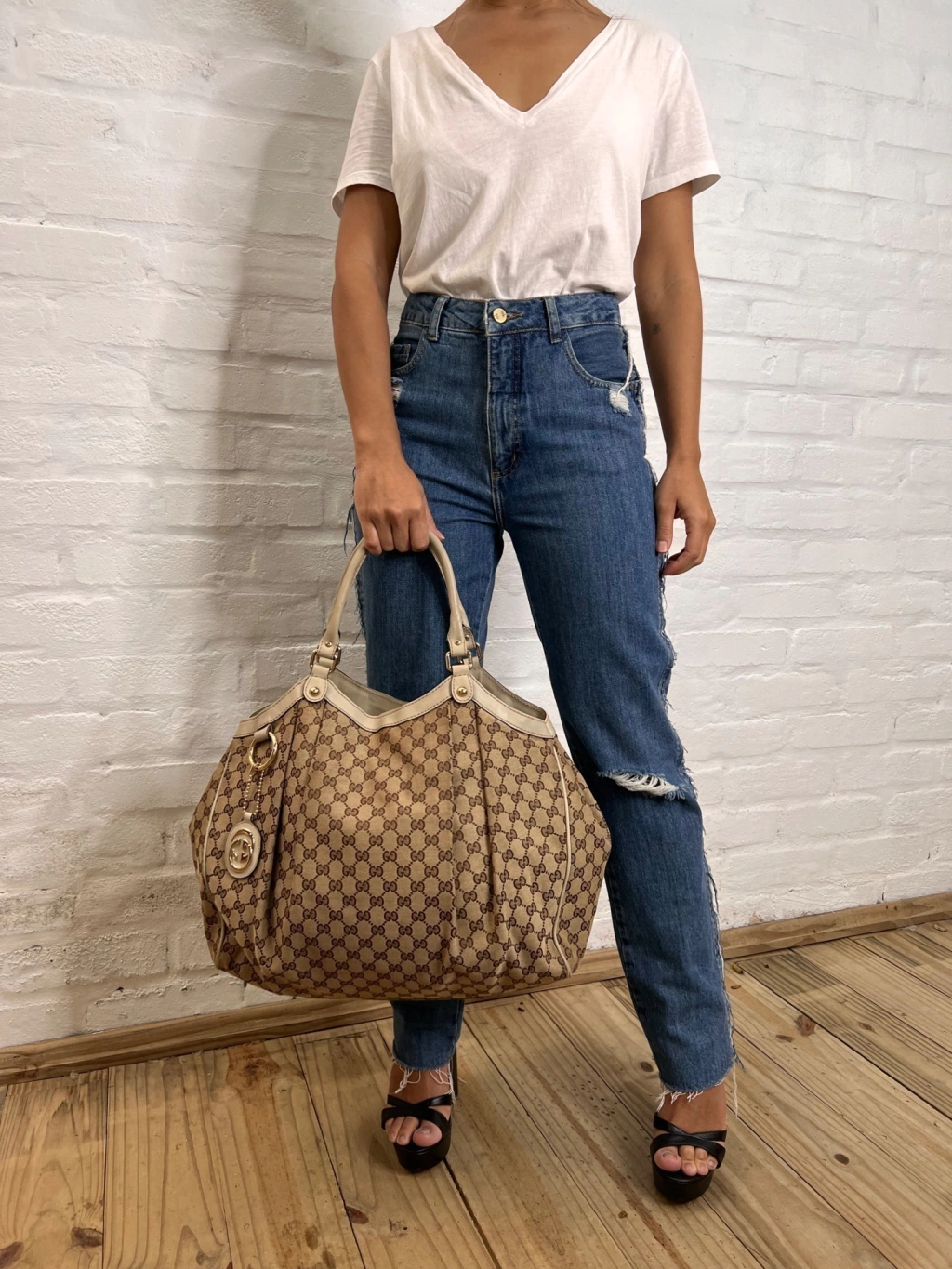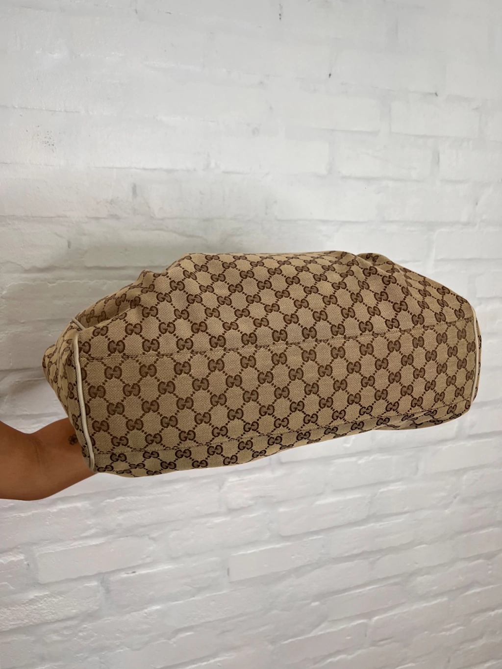 Bolsa Gucci Sukey GG Canvas Dourada Large confeccionada com estampa monograma da marca em tons de marrom e bege e couro dourado. O modelo possui compartimento único com um bolso com fecho por zíper. Conta com alça dupla estruturada de ombro em couro, ferragens douradas, extremidade superior com acabamento em couro, detalhes de studs na base das alças, botões de pressão para expansão nas laterais e fecho principal por tira de couro com botão magnético.